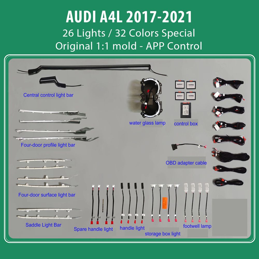 - 26 lights LASER (4 door handle light, 4 door surface background light, 4 door outline light, 4 door storage box light, 4 footwell light, 2 saddle, 2 water cup, 2 left and right center console)